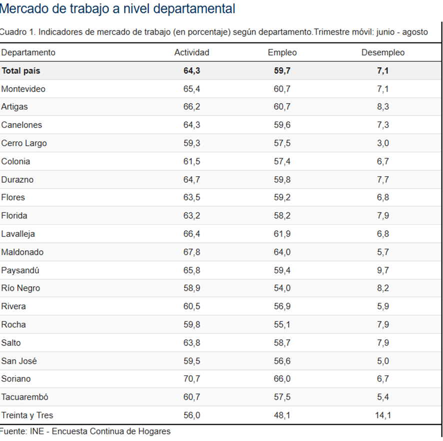 El informe también muestra que, aunque la tasa de empleo departamental varía relativamente poco, las condiciones de formalidad presentan diferencias estructurales. En departamentos como Treinta y Tres, donde la informalidad es de 27,9%, el desempleo llega al 14,1%, el más alto del país.