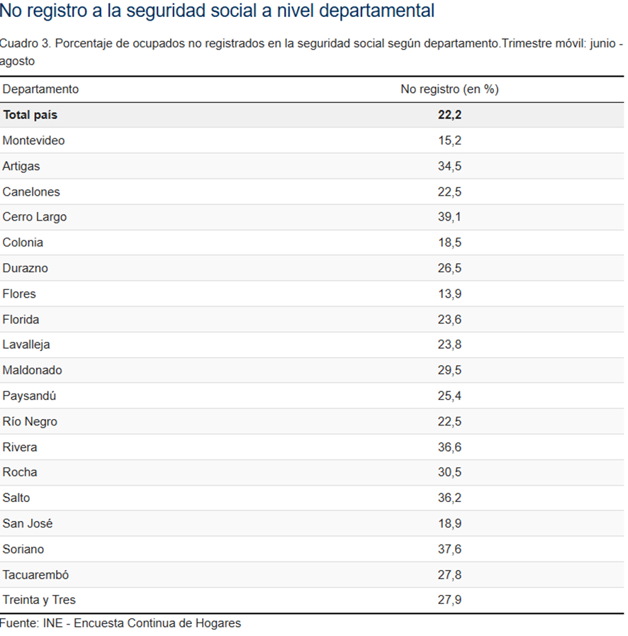 Los datos revelan que Cerro Largo es el departamento con mayor nivel de informalidad, con un 39,1% de ocupados sin aportes, seguido por Soriano (37,6%), Rivera (36,6%), Salto (36,2%) y Artigas (34,5%).