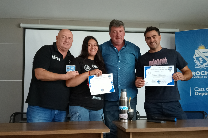 Este martes en Casa de los Deportes fueron reconocidos Yasmila Pintos y Daniel Fernández, de la Escuela Rochense de Artes Marciales Mixtas y del Club CADER como nuevos entrenadores de boxeo. En la oportunidad estuvieron presente el entrenador Claudio Cejas y el director de Deportes de la IDR José Luis Bitabares.