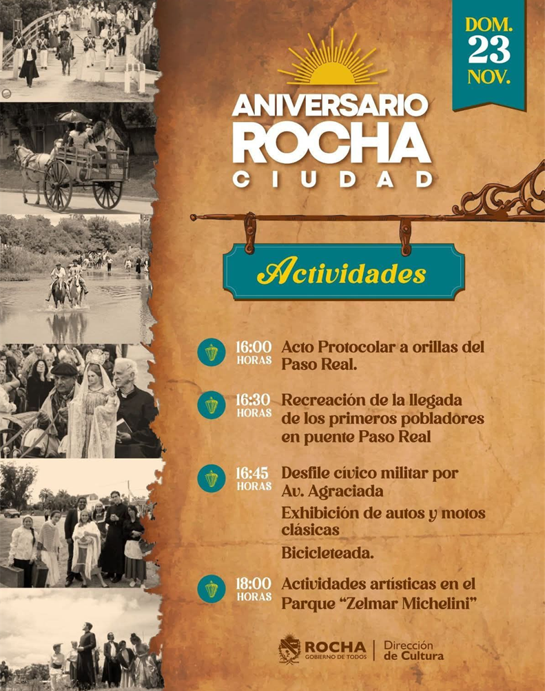 Este domingo 23 de noviembre, desde las 16:00 horas, la ciudad de Rocha será escenario de una propuesta cultural, recreativa y patrimonial que promete convocar a vecinos y visitantes de todas las edades. Con un programa que combina tradición, historia viva, deporte y espectáculos, el aniversario de Rocha vuelve a consolidarse como un punto de encuentro con la memoria y el orgullo local.