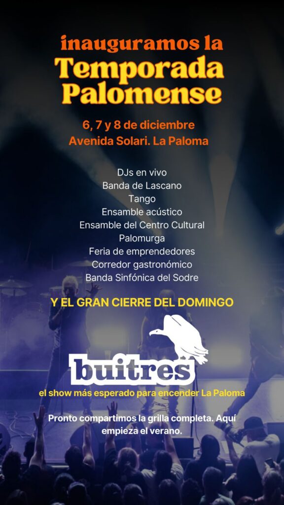 Mientras tanto, los días 6, 7 y 8 de diciembre serán de fiesta en La Paloma, donde se inaugurará la temporada con diferentes actividades en torno a la Avenida Solari, sobresaliendo espectáculos musicales como la presencia de Buitres, el domingo y de la Sinfónica Juvenil del Sodre, el lunes, entre otros. El Municipio de La Paloma y la Asociación de Comerciantes de La Paloma son los promotores de esta movida, que será el inicio de una temporada estival 2025 – 2026 que aparentemente será buena, mejor que la anterior, de acuerdo a lo que han expresado los operadores turísticos del departamento.