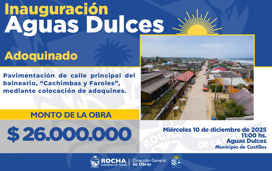 Este miércoles a las 11:00 horas quedará inaugurado el adoquinado en la calle principal del balneario, con una inversión de 26 millones de pesos. En esta oportunidad hay que destacar el trabajo de la Dirección de Obras de la IDR, del Municipio de Castillos, y de los propios vecinos de Aguas Dulces, todo lo contrario a lo que sucedió en Punta del Diablo, donde un grupo minoritario de vecinos paró el adoquinado.