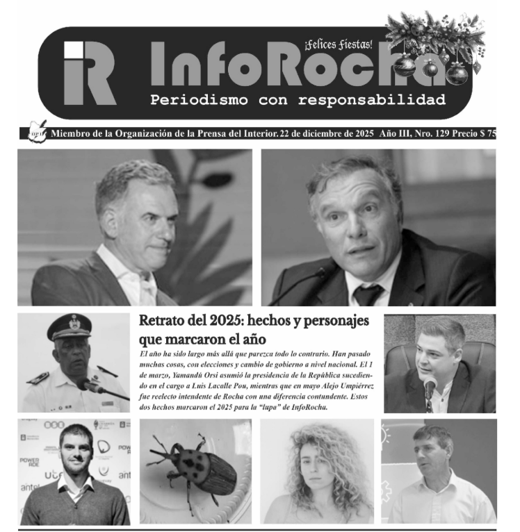 Actualidad Salió InfoRocha con el «Retrato del 2025» diciembre 27, 2025 Más historias Actualidad Gobierno de Rocha presentará dos nuevas unidades 0 Km. diciembre 27, 2025 Actualidad Todo pronto para el “Rocha Music 2026” diciembre 27, 2025 Actualidad DINARA estableció veda para la extracción y comercialización de moluscos bivalvos en Rocha diciembre 26, 2025