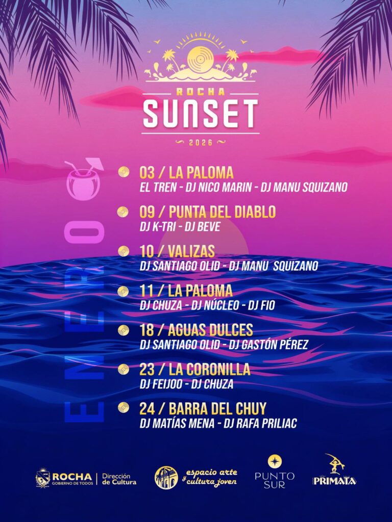 Rocha Sunset es impulsado con el apoyo de la Dirección de Cultura de la Intendencia de Rocha, junto a Espacio Arte y Cultura Joven, Punto Sur y Primata, consolidándose como una propuesta que promueve el acceso a la cultura, el disfrute responsable del espacio público y la circulación de artistas en todo el departamento.