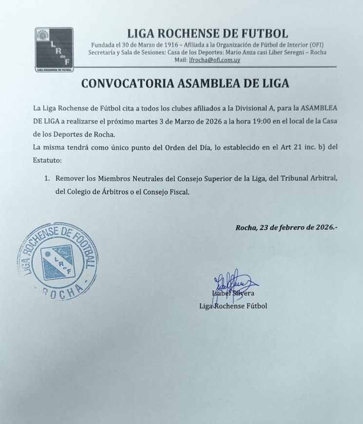 Liga Rochense de Fútbol realizará Asamblea el próximo martes