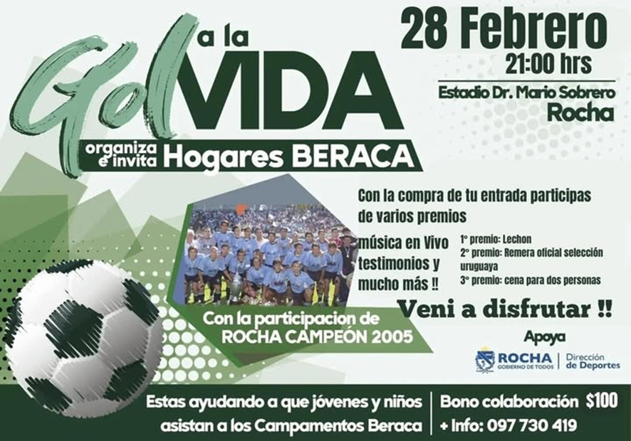En el Estadio Dr. Mario Sobrero se vivirá una noche especial en “Gol a la Vida”, organizado por Hogares Beraca. Habrá música en vivo, testimonios, sorteos y la participación especial de Rocha Fútbol Club Campeón del 2005. Con el bono colaboración se contribuirá a que jóvenes y niños puedan asistir a los Campamentos Beraca. Este sábado desde las 19:00 horas se desarrollará una jornada de fe, deporte y solidaridad.