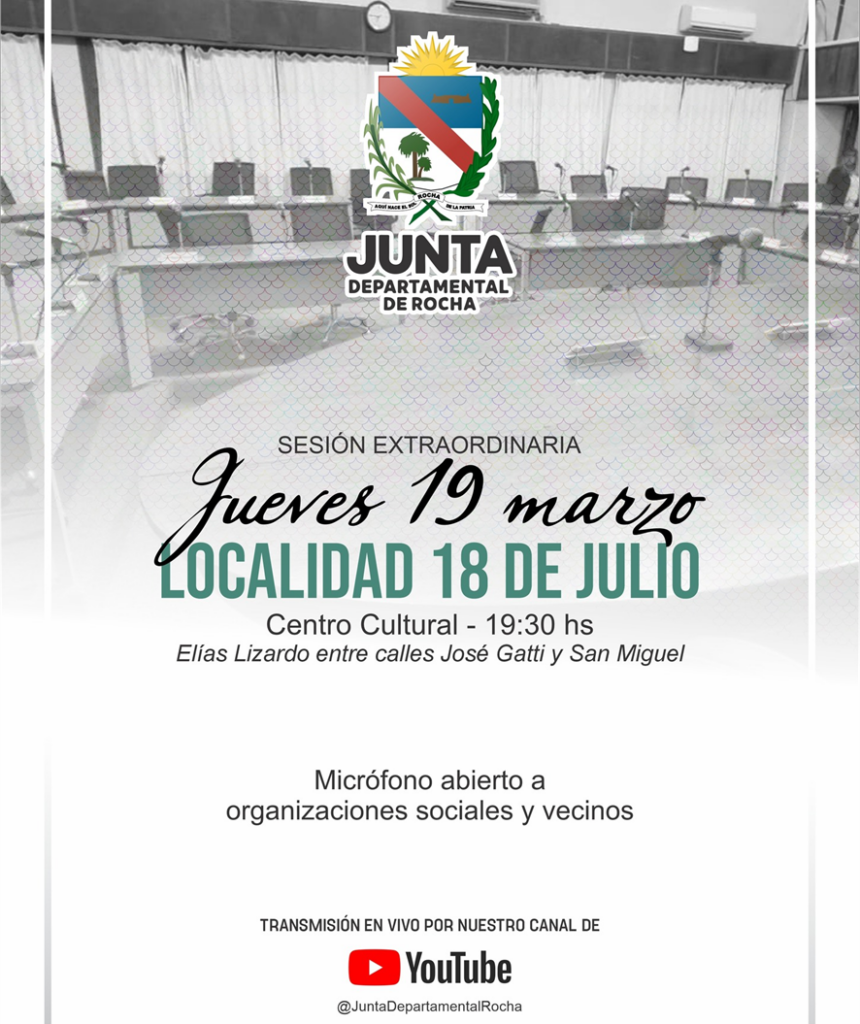 Continuando con las Sesiones Extraordinarias del Legislativo Departamental, enmarcadas en la descentralización, este jueves desde las 19:30 horas los vecinos y organizaciones sociales de 18 de Julio tendrán la posibilidad de trasladar sus inquietudes en el Centro Cultural de dicha localidad. La última Sesión fuera del recinto de la Junta se realizó en La Esmeralda.