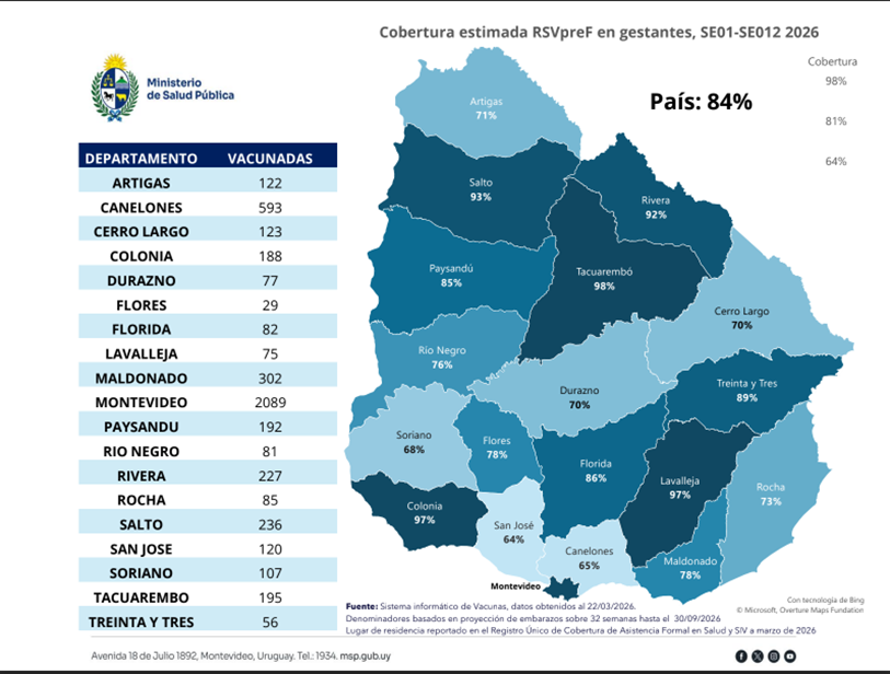 La vacuna contra el Virus Respiratorio Sincitial (VRS), es una dosis única recomendada para embarazadas (semanas 32-36) para proteger a los bebés menores de 6 meses contra la bronquiolitis y neumonía grave. También se recomienda para adultos mayores de 60 años. En Uruguay, está disponible en la campaña 2026.