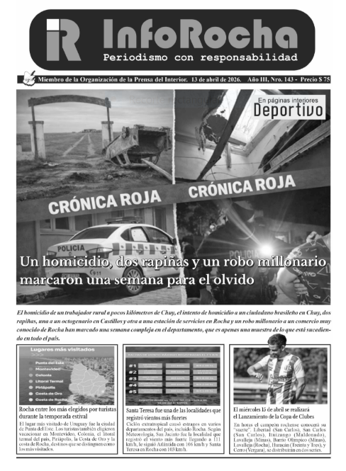 Destacadas ¡Salió un nuevo ejemplar de InfoRocha! abril 14, 2026 Más historias Destacadas En Lavalleja están “Chochos” abril 15, 2026 Destacadas Capataz que mató a empleado en un tambo fue condenado por homicidio ultraintencional a un año de prisión efectiva abril 15, 2026 Destacadas Gobierno de Rocha activa el mayor plan de obras de su historia con una inversión millonaria abril 13, 2026